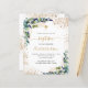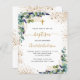 ユーカリ飾の緑と金の葉グリッターとフェイク金ゴールドの塵を持つ白い背景。パーソナライズし、子供の名前と式の詳細。黒と金色の文字先頭へ:白い背景と黄金のフェイクグリッターの塵。
