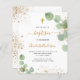 ユーカリの飾緑と金ゴールドのグリッターの塵を持つ白い背景フェイク。パーソナライズし、子供の名前と式の詳細。黒と金色の文字男女兼用.先頭へ:白い背景と黄金のフェイクグリッターの塵。