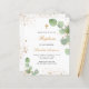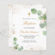 ユーカリの飾緑と金ゴールドのグリッターの塵を持つ白い背景フェイク。パーソナライズし、子供の名前と式の詳細。黒と金色の文字男女兼用.先頭へ:白い背景と黄金のフェイクグリッターの塵。