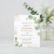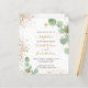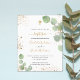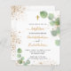 2人の子供のバプテスマのために。ユーカリの飾緑と金ゴールドのグリッターの塵を持つ白い背景フェイク。パーソナライズし、子供の名前と式の詳細。黒と金色の文字男女兼用.先頭へ:白い背景と黄金のフェイクグリッターの塵。