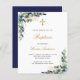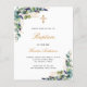 ユーカリの飾緑と金の葉と金のクロスとの白い背景。パーソナライズし、子供の名前と式の詳細。黒と金色の文字背面:ネイビーブルーの背景色。