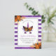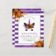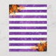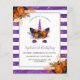 この秋をテーマにした誕生日パーティーへの招待エレガントは、オレンジ、黒、紫のフローラの花束で飾られた紫のグリッターのホーフェイクンを持つユニコーンの顔を特徴としている。紫色のカスタマイズ手書きフォントに表示される誕生日女の名前と誕生日の番号を使用できます。長方形のフレームの背後には、紫のグリッターと白いの背景があストライプる。オレンジと黒のフローラ飾は角の2つの花束。カードの背面に同じ花束が表示され、背景が一致する。