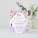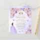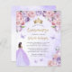 この素敵なキンチェニェラの招待縁どは、紫の水の色の背景に薄紫紫と赤面のピンクのバラの香りを特徴とする。金ゴールドティアラ、紫色のプリンセスドレスと小さな紫色の蝶のブルネットの女飾の子の文字。金ゴールド色の手書きスクリプトには「キンセアニラ」と名誉のゲストの名前が表示さエレガントれ、残りの文字は灰色のサンセリフフォントで表示される。お客様がQuinceaeneraのウェブサイトとRSVPをオンラインで訪問するQRコードと共に、背面に追加の文字を追加す救済る。