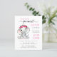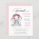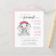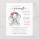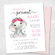 ピンクとソフトフレンドリーグレーのタイポグラフィとスワッシュとベビーガールの象の水の色と頭にフローラのリースを付け書てかわいらし、スクリプトのミックスで、"私たちの甘い小さなピーナッツは彼女の道にある"かわいいバジェット女の子のベビーを振りかける。赤ちゃんのIrlと母親の名前をピンクのタイポグラフィでパーソナライズし、灰色のタイポグラフィの散水シンプル詳細モダン。