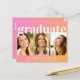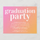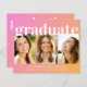 トレンディー白フレンドリーフォントで卒業した卒業生の3つの写真コラージュと名前、学校とクラスの年を含む白タイポグラフィのではっきりした、バジェット・ピンクとオレンジの卒業式パーティの招待を掲げシンプルてモダン、卒業パーティーの招待。背面には同じ白いフォントとパーティー詳細の「卒業はっきりしたパーティー」が備えられている。