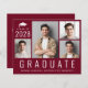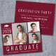 予算のフレンドリーミニマルモダン書で燃える赤い卒業発表とパーティの招待状4枚の写真コラージュを搭載したと大きな白い文字で「卒業」、彼または彼女のクラスの年、名前と学校や大学の白いタイポグラフィ。反対側にパーティー詳細を追加する。