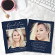 バジェット女子エレガントのダークブルーの卒業発表と白い台本と白いタイポグラフィでエレガント「卒業お祝い」を特集したパーティの招待状と写真と彼女の名前、学校とクラスの年を含む白いタイポグラフィでモダンすフレンドリー。背面に、別の写真と卒業パーティーの詳細を追加。