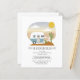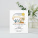 青と白のレトロなヴィンテージのキャンプトレーラーのイラストレーションと冒険をテーマにした男の子のシャワーぶら下がったは、サボテンに接続された衣料品の上に太陽と雲と砂漠の日の出の空を文字は言う「冒険が始まる」