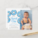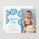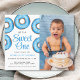 招待状の家族と友人の男の赤ちゃんの最初の誕生日パーティーこの可愛い予算1st誕生日招待状。青い水飾色のドーナツと言う「彼は甘い人だ」写真や詳細で簡単にカスタマイズできる。オリジナル水彩©ミケーレ・デイヴィス。