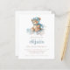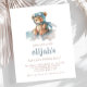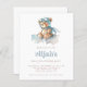 この可愛い最初の誕生日パーティーの招待は、ブラウンイタリックフォントの言葉の上に青いスカーフとアヴィエーターゴーグルに甘い水色のテディベアを含む。青いスケッチレタリングで子供の名前をカスタマイズし、白い背景に茶色のサンセリフフォントの詳細を付ける。男の子の熊、冒険、旅行、または飛行機をテーマにした最初の誕生日パーティーに最適。
