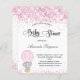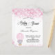 赤ん坊のシャワー祝は、赤ん坊の女の子。白い背景。赤面飾ピンクのフェイクグリッターの塵と、熱い気球の中で可愛い小さなベビー象の女の子と。Mom to-beの名前とパーティー詳細の名前をカスタマイズして追加する。名前と文字:赤ちゃんシャワーは手書で書かれたスタイルの台本と共にある