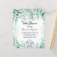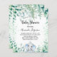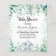 赤ん坊のシャワー祝は、男の赤ちゃんだ。白い背景。かわいい小さなベビーゾウの少年とユーカリの緑と緑のキラキラ。Mom to-beの名前とパーティー詳細の名前をカスタマイズして追加する。名前と文字:赤ちゃんシャワーは手書で書かれたスタイルの台本と共にある