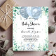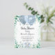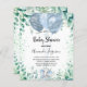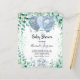 赤ん坊のシャワー祝は、男の赤ちゃんだ。白い背景。青い飾風船、かわいい小さなベビーゾウの少年とユーカリの緑と緑のキラキラ。Mom to-beの名前とパーティー詳細の名前をカスタマイズして追加する。名前と文字:赤ちゃんシャワーは手書で書かれたスタイルの台本と共にある