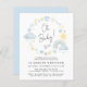 ボホパステルの青と黄色の水の色の虹と太陽とハート、星、月と雲のボホフレンドリーのパステルの青と黄色の写真と書き物の台本にインスパイアはお洒落、予算と予算の多い男の赤ちゃんのシャワーの招待スタイリッシュ。