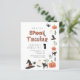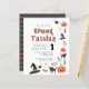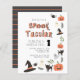 手描きモダンの魔女帽子、黒猫、かわいい幽霊たち、クモ、カボチャのアンサンブルとダークグレーとオレンジのをテーマにしたハロウィーンをテーマにしたバースデーパーティストライプ。