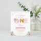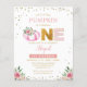 祝ベビーの初のマイルストーンこの秋時間あなたの友人や家族と共有にあなたの小さな一人の喜びでする。秋バラ、緑の葉、金ゴールドグリッター、背中のピンクの水色の背景と簡単をカスタマイズするテンプレート表現を備えた水色ピンクのカボチャを特徴とするかわいい予算の招待。