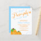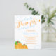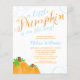 可愛い小さなかぼちゃの男の子の予算ベビーシャワー招待状パーソナライズされたは、簡単にオンラインテンプレートフィールドを使用することができる。秋をテーマにしたデザインで、2色のオレンジ色のカボチャ、渦巻き、青と秋のオレンジ色モダンのスクリプトフォントを使用。