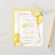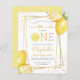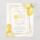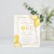 この柑橘系をテーマにしたレモネードの最初の誕生日パーティーへの招待は、水の色のレモンで飾られた金ゴールド幾何学的なフレームを特徴とする。「ONE」という言葉は黄色の大文字で表示され、「O」の代わりに水色のレモンスライスが付いている。 黄色の手書き文字で小さな恋人の名前と誕生日を追加モダンし、パーティー詳細で木炭の灰色のサンセリフ。カードの裏が黄色無地のい。夏のテーマパーティーに最適!