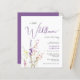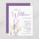 予算のエレガント中でフレンドリー、女の子のシャワーの招待は、ソフトな灰色のタイポグラフィと紫のスクリプトの組み合わせモダンて「小さな野生の花が彼女の道にある」とインスパイア、豪華な紫、ピンクと黄色の野生の花のboho – 色の花束スタイリッシュ。
