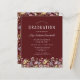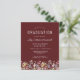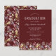 ワイルドフラワーの美しい縁ど水色のフローラは飾、このトレンディーボーホ卒業式パーティーの招待の下端。赤い背景カスタマイズの白い文字で、卒業生の名前は手書き文字で、学校とクラスの年はsans serifで、日付、場所、およびRSVP詳細はserifのフォントで。カードの裏には、バーガンディな背景にワイルドフラワーの調整パターンが付いている。
