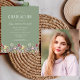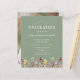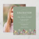 ワイルドフラワーの美しい縁ど水色のフローラは飾、このトレンディーボーホ卒業式パーティーの招待の下端。カスタマイズは、卒業生の名前を手書きスクリプトで示した緑色のセージの背景の白い文字、sans serifの学校とクラスの年、serifのフォントの日付、場所、およびRSVP詳細。背面のサンプル画像を卒業生の縦の写真に簡単に置き換える。