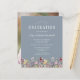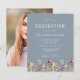 ワイルドフラワーの美しい縁ど水色のフローラは飾、このトレンディーボーホ卒業式パーティーの招待の下端。カスタマイズは、卒業生の名前が手書きスクリプトで書かれた埃っぽい青い背景の白い文字、sans serifの学校とクラス年、serifのフォントの日付、場所、RSVP詳細。背面のサンプル画像を卒業生の縦の写真に簡単に置き換える。