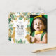 お子様祝の最初の誕生日に向けてフェイクは、招待状のゲストがこのジャングルのサファリをテーマにした招待状を使用して、緑と金ゴールドのフォイルのジャングルの葉と動物(キリン、ライオン、サル)のコレクションを手で描かれたタイポグラフィの「ワイルドワン」の単語を取り囲む。サンプル画像を誕生日の男の子お気に入りのまたは女の子の写真に簡単に置き換える。カードの裏には緑と金ゴールドのジャングルの葉のパターンが付いている。