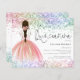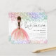 カラー数々のグリッターガウンキンセアニェラ招待状。4.5インチx 5.6インチの低価格の代替品。デフォルトのオプションであるセミグロス110 lbカードストック(招待状の場合は厚い)またはサテン仕上げ80 lbシンナー紙ストック(エンクロージャの場合は理想的)で利用可能。封筒はオプションの追加カードで、カードサイズより少し大きい。美しいピンクのボールガウンとレインボーカラーのグリッターの上と下の美しいピンクの髪の少女のバックビューのイラストレーションとキンセアニェラのための輝かしいエレガンス縁ど。メインのヘッダーは、セットの手書きスタイルスクリプト内にあり、詳細に文字の残りの部分を簡単にカスタマイズできる。