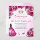 ピンクの水色の背景に縁ど明るい赤紫色のピンク色のバラが並ぶ素敵なキンチェニェラの招待。金ゴールドティアラ、明るい赤紫色プリンセスドレスの黒髪の女の子と小さなピンクの蝶の飾文字。"Quinceaenera"という言葉と名誉のゲストの名前はエレガント、明るい赤紫色の手書きスクリプトに現れ、残りの文字は灰色のサンセリフフォントで表示される。