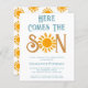 招待状の家族と友人の男の赤ちゃんの赤ちゃんシャワーこの太陽をテーマにした予算の赤ちゃんシャワーの招待。鮮やかな水色の太陽と青来色のレトロなタイポグラフィの文字「ここThe Son」を特徴としている。背中は飾日模様だ。簡単にカスタマイズ可能オリジナル水彩©ミケーレ・デイヴィス。