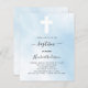 Aモダン、バエレガントプテスマ祝、男の赤ちゃんだ。白い十字と背景飾の明るい青空。名前と詳細のパーソナライズおよび追加黒い文字。