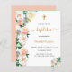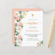 トレンディーフローラバプテスマの招待で白、ピンクとバラ金ゴールド。正面にシックな白い背景。大き飾い、緑豊かな水色の花、花模様。子と式の詳細の名前をカスタマイズして追加。黒金色の文字。戻る:バラ金ゴールド色の背景。