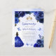 青い水の色の背景に青い縁どバラのを取り入れた素敵なキンチェニェラの招待。金ゴールドティアラ、青い王女のドレスと小さな青い蝶王室のの黒い髪の女の子飾の文字。"Quinceaenera"という言葉と名誉のゲストの名前は青い手書き文字で現れエレガント王室の、残りの文字は灰色のサンセリフフォントで表示される。