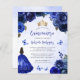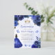 青い水の色の背景に青い縁どバラのを取り入れた素敵なキンチェニェラの招待。金ゴールドティアラ、青い王女のドレスと小さな青い蝶王室のの黒い髪の女の子飾の文字。"Quinceaenera"という言葉と名誉のゲストの名前は青い手書き文字で現れエレガント王室の、残りの文字は灰色のサンセリフフォントで表示される。お客様がQuinceaeneraのウェブサイトとRSVPをオンラインで訪問するQRコードと共に、背面に追加の文字を追加す救済る。