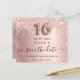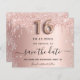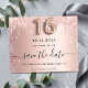 AとガーリートレンディーSweet 16, 16th birthday partyの日付カードを保存する。バラ金ゴールドフェイク金属調の背景飾にバラ金ゴールドと銀フェイクグリッタードリップとダストを含む。日付と名前/文字のパーソナライズおよび追加文字:日付を保存するスワ書ッシュ付きの大きなトレンディーの手で書かれたスタイルスクリプトがある。番号16、バルーンスタイルフォント。