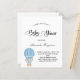 赤ん坊のシャワー祝は、赤ん坊の女の子。白い背景と、青い熱い空気のバルーンの中でかわいい小さなベビーゾウの少年。Mom to-beの名前とパーティー詳細の名前をカスタマイズして追加する。名前と文字:赤ちゃんシャワーは手書で書かれたスタイルの台本と共にある
