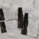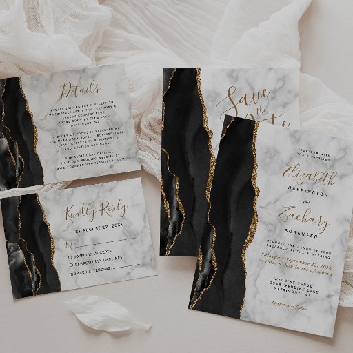 このエレガント予算の結婚式は、日付カードを保存し、黒い水の色のアゲート縁どトを金ゴールドのグリッターでトリミングフェイク。カスタマイズ可能な文字は、グレーと白の大理石の背景に黒と金ゴールド色の手書きスクリプト、コピープレートと斜体のフォントを組み合わせている。裏面は、一致する黒と金ゴールドゲートデザインを備える。
