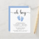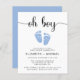 キュートな予算フレンドリーカップルの男の赤ちゃんシャワーの招待状と"ああ男の子"のスクリプトでスウェッシュとパステルスタイリッシュブルーの水の色ベビー足。下に簡単にシャワー詳細をパーソナライズできる。