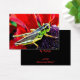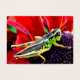 華やかな赤い花びらの花の中心に輝く緑、黄色、黒のキリギリスが立ち並ぶ鮮やかな色のアーティストトレーディングカード。