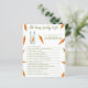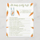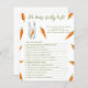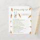 男女兼用ベビーシャワー招待状。ことわざ「小さなバニーが道に!」をフィーチャーした水色のバニー(ウサギ)とニンジンのイラストレーション、そしてオレンジ色のニンジンの多くの。一致する項目が使用可能。