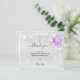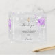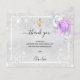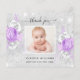 写真シンプル付きエレガントサンキューカードと写真。銀の金フェイク属の外観の背景、白いフレーム、フェイクグリッターの塵、紫のバラ、花模様。黄金の十字架。お礼のノート、赤ちゃんの女の子の写真と名前をカスタマイズして追加。ブラック文字。
