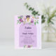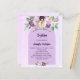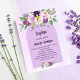 紫色のラベンダー色の水色の背景。紫飾色と紫の水色の花と金色の十字を持つパーソナライズおよび名前と披露宴詳細1枚= 1枚の招待状を印刷したエッジからエッジ