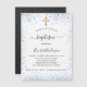 Aモダン、バエレガントプテスマ祝、男の赤ちゃんだ。青い飾グリッターの輝きと金のクロスと白い背景。名前とパーティー・詳細のパーソナライズおよび追加黒い文字。