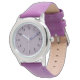 黒い色無地のの「バラクォーツ」の女の子の腕時計と猫の前時計の画像。バラクオーツは灰色がかった紫で、マゼンタの中程度の明るい色合い。クリック色を変える、またはパターンやデザインを追加するために「オン」に設定する。製品16進コード: #aa98a9