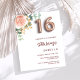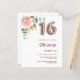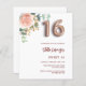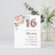 女のモダン子のスタイリッシュ甘い16、16th誕生日パーティーのための魅力的で魅力的な招待。ホワイト背景.バラ飾金ゴールドと赤面ピンクフローラと。名前は暗い書バラ金ゴールド色の手でスタイルスクリプトと一緒に。カスタマイズしてパーティー詳細を追加する。16番はバ書ロンスタイルフォント、スクリプト付き。1枚= 1枚の招待状を印刷したエッジからエッジ