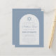 お手頃価格のバル・ミツヴァの招待状。ダスティーブルーの背景に、白いアーチがあり、その中にはダスティーブルーの文字が書かれている。名前は優雅なカリグラフィーで書かれている。文字の上には、ダスティーブルーのダビデの星がある。