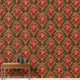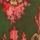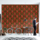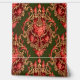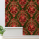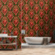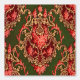1900バロック式ロココスタイルパターンの大規模なスクロール葉状および葉状スワッグとバラと滴下フローラメダリオンから派生したデジタル的に強化されたプリントである。赤い地面に緑、赤、ピンク、白で印刷。