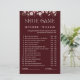このエレガントなバーガンディーブライドインブルームテーマのフラワールゲームで、あなたのブライダルシャワーを忘れられないものにしましょう。 ゲストが新婦または新郎がそれぞれの質問に答えるかどうかを靴を上げて推測する、楽しくてインタラクティブな結婚式ゲーム。 15の完全にスペースのある質問、スタイリッシュなバーガンディーの背景と柔らかな花、そして完全に編集可能なテキストを備えたこのゲームは、どのカップルでも簡単にカスタマイズできます。 ブライダルシャワー、エンゲージパーティー、バチェロレッテパーティー、結婚式のお祝いに最適です。 このシューゲームは、あなたの特別なイベントに笑いとチャームを加えます。