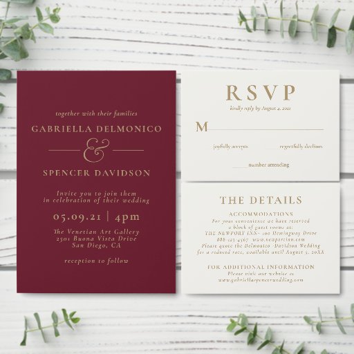 このエレガントな結婚式の招待状は、シックなモダンデザインを備えている。フロントは金ゴールドタイポグラフィのモダンクリームで、裏面は金ゴールドタイポグラフィのイニシャルで豊かなブルゴーニュ。