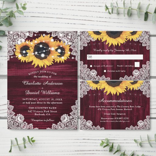 ひまわりエレガント結婚式招待状ひまわり花によるロマンチックなブルゴーニュの素朴なウェディングインスパイアパーティーに理想的。一致する項目が使用可能。